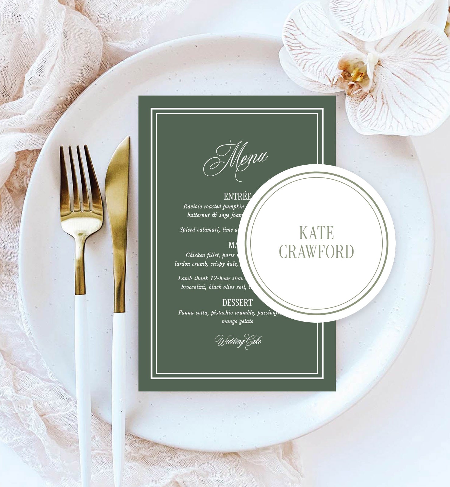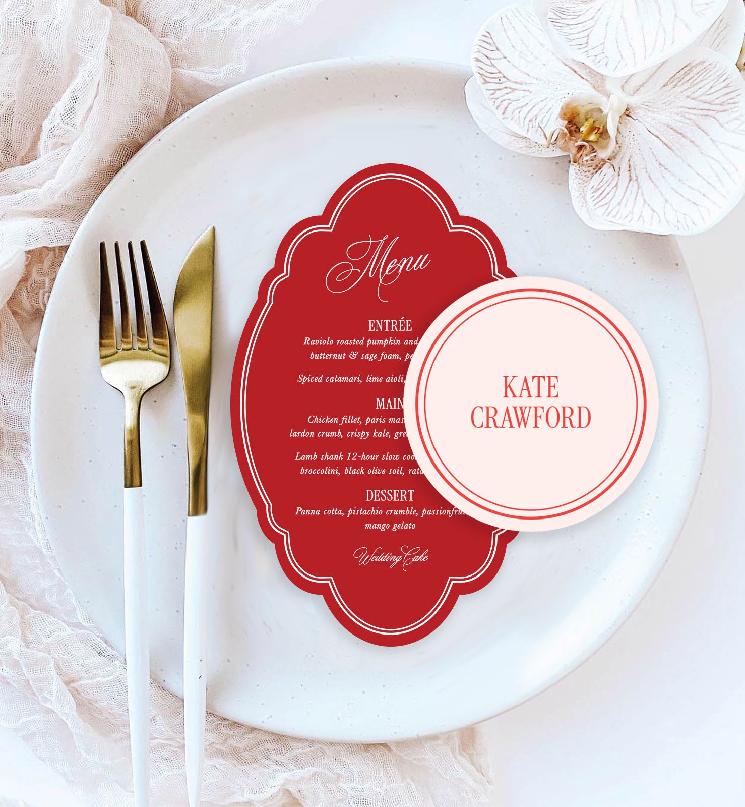 • Menu, 120x180mm and place card in your chosen shape and colours.